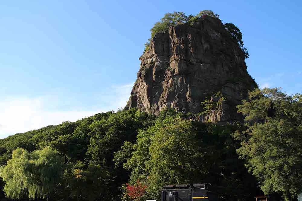 遠軽町のシンボルである瞰望岩(がんぼういわ)は、鉄道で遠軽に訪れると左側の車窓に映る。かつては戦で砦として使われていた場所である。