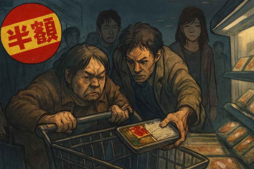 午後八時、イオンの売れ残った弁当に赤い半額シールが貼られる。その瞬間、空気が変わる。人々はカートを止め、目を光らせ、距離感を失う。誰かが一歩踏み出せば、群れは連鎖的に動き出す。まるで池にエサが投げ込まれた瞬間の鯉だ。