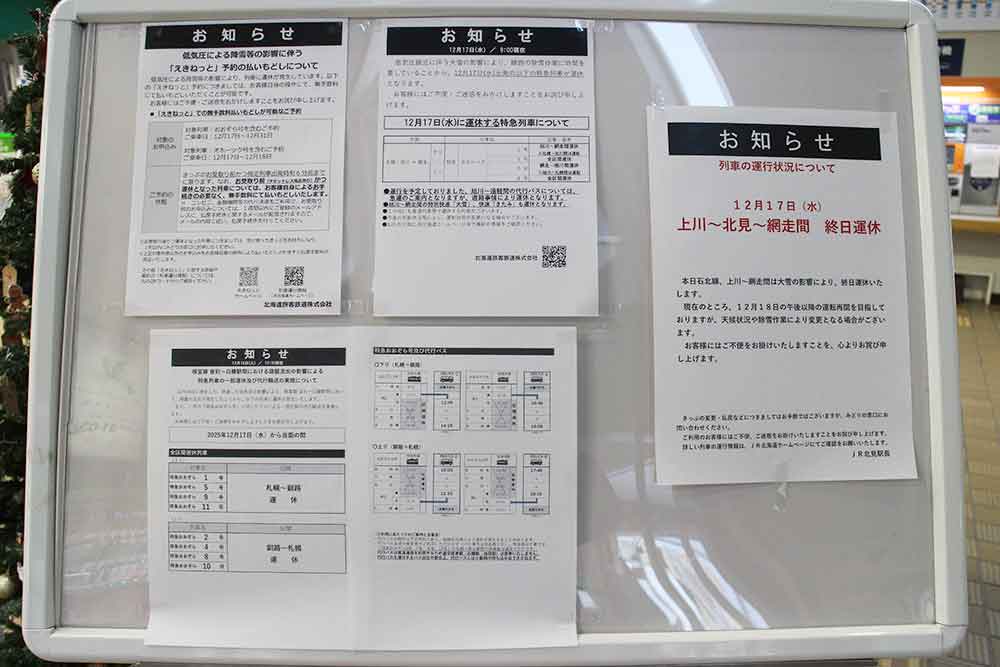 19日になり、JR北海道の運行情報を眺めると、ようやく遠軽〜網走の普通列車は再開してくれた。上川〜遠軽はまだ除雪中で、快速や特別快速、特急は運休だった。網走から先の釧網本線は全便運休。