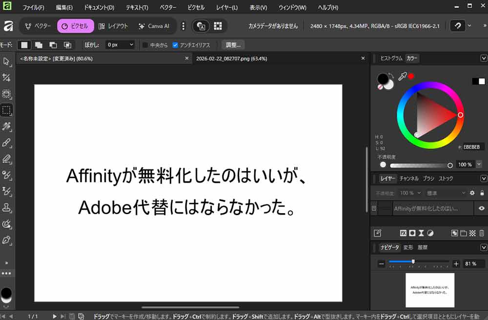 かつてAdobeが完全サブスク型に移行した一方、PhotoshopやIllustratorなどと機能的に近いとされる買い切り型アプリとして話題になったのがAffinityというアプリだ。